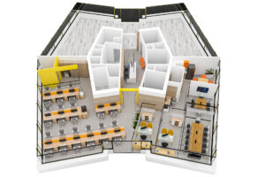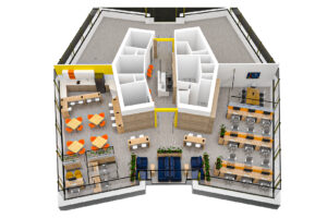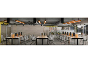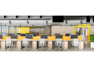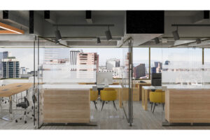 El diseño interior combina materiales cálidos con acentos en amarillo y azul, evocando energía, innovación y confianza. Los espacios abiertos promueven la colaboración y la creatividad, mientras que las áreas privadas garantizan confort y concentración.